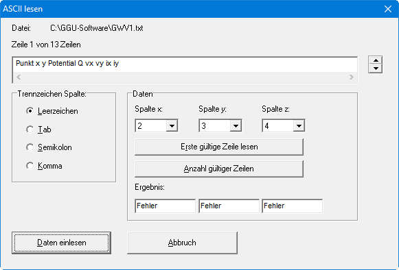 Oben wird die aktuelle Zeile der ASCII-Datei angezeigt. Mit den Pfeilen am rechten Rand bewegen Sie sich durch die Datei. Falls alle Angaben richtig sind, erscheint in der Box unter den Spalten das Ergebnis für diese Zeile. Anderenfalls erscheint "Fehler". Verändern Sie dann gegebenenfalls das Trennzeichen für die Spalte. Enthält die Datei neben gültigen auch ungültige Zeilen, werden diese beim späteren Einlesen einfach überlesen. Zum Schluss wählen Sie den Knopf "Daten einlesen". Danach können Sie die eingelesenen Koordinaten und Potentiale weiterverarbeiten.