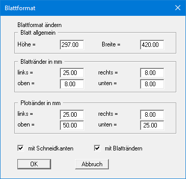 "Blatt allgemein" definiert die Größe Ihres Ausgabeblattes. Voreingestellt ist ein DIN A3-Blatt. Das Programm zeichnet automatisch um das Ausgabeblatt dünne Schneidkanten, die beim Ausdruck auf Plottern mit Rollenmedien benötigt werden. Die Schneidkanten können durch Ausstellen des Schalters "mit Schneidkanten" ausgeblendet werden.