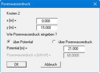 Dieser Menüeintrag ermöglicht die nachträgliche Änderung der Koordinaten und des Potentials für einzelne Dreiecksknoten. Die Bedienung ist entsprechend der Meldung innerhalb der Box. Ein Doppelklick mit der Maus auf Knoten Nummer 2 eines Beispiel-Porenwasserdrucknetzes würde folgende Box aufrufen.