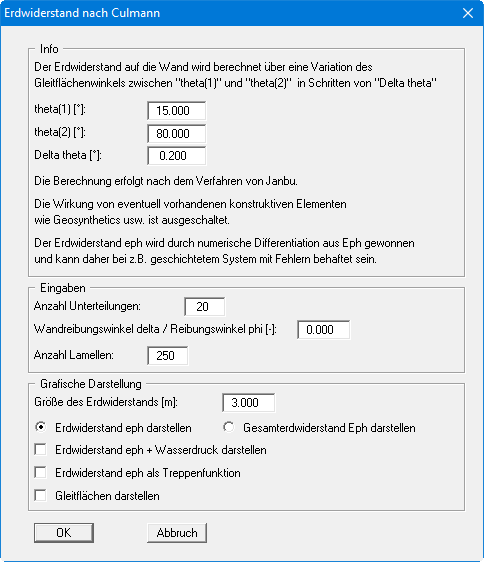 Über diesen Menüeintrag können Sie den Erdwiderstand nach Culmann bestimmen lassen. Sie erhalten die folgende Dialogbox: