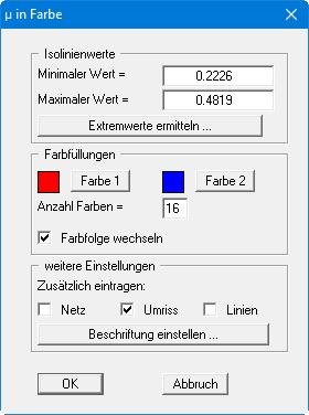 Mit "Anzahl Farben" steuern Sie die Farbunterteilung des Isolinienplans. Im obigen Beispiel würden 16 Farbabstufungen zwischen den Farben "Farbe 1" und "Farbe 2" vorgenommen werden. Voreingestellt ist ein Verlauf von rot nach blau. Sie können diese beiden Farben nach Anwahl der Knöpfe "Farbe 1" bzw. "Farbe 2" beliebig verändern oder einfach über den Schalter "Farbfolge wechseln" den Farbverlauf umdrehen.Bereich "weitere Einstellungen"
