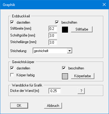 Sie können die grafische Darstellung des Erddruckkeils und des Gewichtskörpers verändern. Enthält Ihr System mehr als 1 vernagelte Böschungskante, ist der Menüeintrag nicht anwählbar.