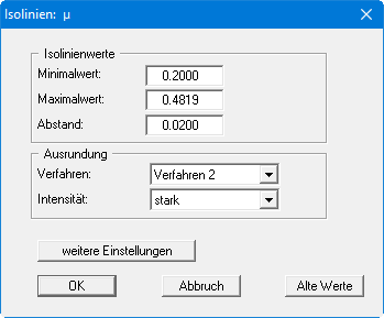 Oben sind der minimale (nach unten gerundet) und der maximale Ausnutzungsgrad eingetragen. Darunter folgt ein vom Programm berechneter Abstand der Isolinien. Alle drei Werte können Sie nach Ihren eigenen Vorstellungen ändern. Darunter können Sie zwischen drei Ausrundungsverfahren wählen, wobei das Verfahren 2 die rundesten Isolinien erzeugt, andererseits bei abrupten Sicherheitssprüngen nicht exakt den Sicherheitsverlauf nachbilden kann. Mit dem Knopf "weitere Einstellungen" können Sie weitere Einstellungen hinsichtlich der Darstellungsform vornehmen. Wenn Sie diesen Menüpunkt vorher bereits einmal angewählt haben, können Sie die vorherigen Werte mit dem Knopf "Alte Werte" zurückholen. Wenn Sie die Box über "OK" verlassen, wird die Darstellung der Isolinien veranlasst.