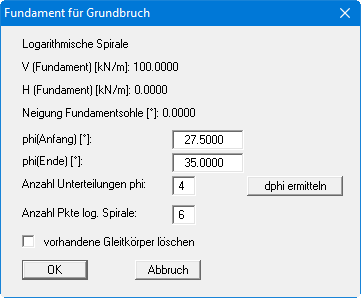Wenn Sie im Menüeintrag "Editor 1 / System einstellen" den Schalter "Grundbruch" aktiviert haben, können Sie für das Streifenfundament polygonale Gleitflächen erzeugen, die gemäß DIN 4017 im Mittelbereich aus einer logarithmische Spirale bestehen, an deren Endpunkten sich Geraden anschließen.