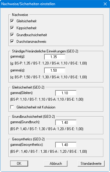 Über den Knopf "Standardwerte" können Sie die Teilsicherheitswerte der DIN 1054:2010 bzw. des EC 7 für die verschiedenen Lastfälle übernehmen lassen (siehe Menüeintrag "Editor 1 / Teilsicherheiten …").
