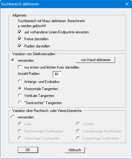 Zur Definition des Suchbereichs erhalten Sie über diesen Menüeintrag die folgende Dialogbox. Wenn Unsicherheit bezüglich des Suchbereichs besteht, sollten Sie immer den Suchbereich "Horizontale Tangenten" wählen und je nach Sicherheitsbedürfnis eine höhere Anzahl der Radien (40 oder größer) wählen.