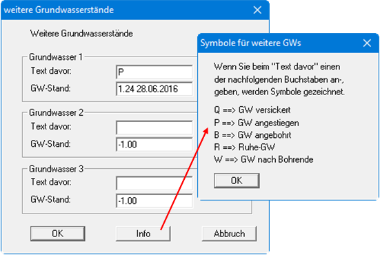 Hinter dem Messwert können Sie auch hier mit einem Leerzeichen Abstand z.B. das Messdatum eingeben. Die Darstellung eines Grundwassersymbols erreichen Sie über die Eingabe des entsprechend definierten Buchstabens im Feld "Text davor". Die Erläuterungen zu den Buchstaben erhalten Sie über den "Info"-Knopf in einer Dialogbox angezeigt.