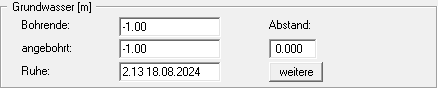 Über Ihre Eingabe legen Sie den Abstand der Grundwasserbeschriftung vom Bohrprofil fest. Der Abstand kann nachträglich auch für mehrere eingegebene Bohrprofile über den Knopf "für alle" (Reiter "Grundwasser + Texte links") in der Dialogbox "Eingabe / Bohrprofil" geändert werden (siehe “GGU-STRATIG: Bohrprofil auswählen oder neu anlegen”)."weitere"