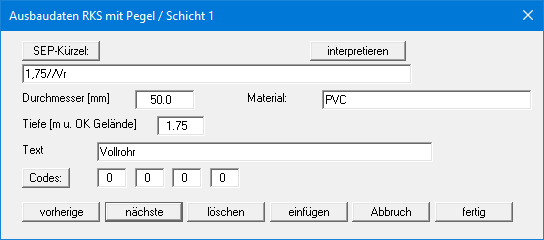 GGU-STRATIG: Beispiel - Schichten für Pegelausbau definieren (Knopf "Ausbau")