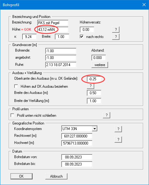 In den Grunddaten des Bohrprofils wird unter "Bezeichnung und Position" die Ansatzhöhe der Sondierung (= GOK = OK Gelände) eingegeben. Die OK Gelände entspricht immer der OK Verfüllung.