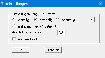 Sie können Ihre Schichtenbeschreibung in die Langtextzeilen A1, A2 und B eintragen oder über SEP 2-Kürzel interpretieren lassen. Für die spätere grafische Darstellung der Schichtenbeschreibung am Bohrprofil stehen Ihnen die Einstellungen in der folgenden Dialogbox zur Verfügung, die Sie über den Knopf "Einst. Texte" in der allgemeinen Editorbox Ihres Bohrprofils aufrufen. Standardmäßig ist bei Programmstart die Einstellung "zweizeilig" vorgegeben.