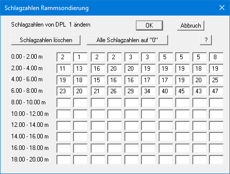 Als Standard ist hier ein Abstand von 0,10 m für eine Rammsondierung eingetragen. Wenn Sie mit einem anderen Abstand arbeiten, tragen Sie diesen hier ein. Die Bezeichnungen der Knöpfe zur Eingabe der Schlagzahlen bleiben zwar unverändert ("Schlagzahlen 0 - 10 m" etc.), nach Aufruf der Dialogboxen der Knöpfe sehen Sie jedoch die angepassten Tiefenangaben, in der nachfolgenden Dialogbox bspw. bei einem Abstand von 0,20 m:
