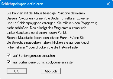 Über diesen Menüeintrag können Sie z.B. geologische Schnitte erzeugen. Sie erhalten alle Informationen zur Definition von Schichtpolygonen in einer Infobox angezeigt: