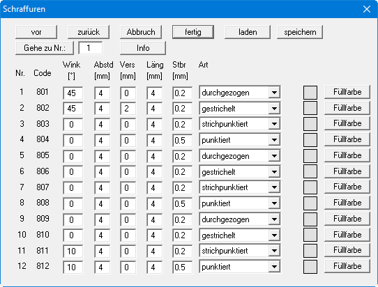 Für die Füllung von Flächen mit Schraffuren stehen die Codenummern 801 bis 850 zur Verfügung.