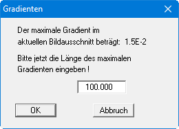 Über diesen Knopf können Sie ein Gradientenfeld erzeugen lassen. Die Gradienten werden für jedes Dreieck aus den drei Messwerten der Eckpunkte berechnet. Die Länge der Gradienten können Sie über die Dialogbox steuern, die beim Anklicken erscheint.