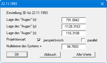 Dazu wählen Sie zunächst den Betrachtungspunkt (Lage des Auges in x-, y- und z-Koordinaten) sowie die Projektionsart und die Nullebene der 3D-Darstellung. Von der Nullebene (z-Ordinate) aus werden die Messwerte nach oben oder nach unten dreidimensional aufgetragen. Im Allgemeinen macht das Programm für die Eingabewerte dieser Dialogbox sinnvolle Vorgaben, so dass Sie Änderungen nicht vornehmen müssen.