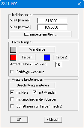 Nach Verlassen der Dialogbox mit "OK" erhalten Sie folgende Dialogbox, die im Wesentlichen der Box unter dem Menüeintrag "Isolinien / darstellen" Knopf "Isolinien farbig" gleicht.