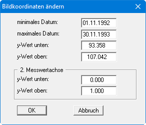 In einer Dialogbox können Sie die Bildkoordinaten über direkte Zahleneingabe verändern. Die Dialogbox zeigt die jeweils aktuellen Einstellungen für die momentan gewählte Darstellung. In der beispielhaft dargestellten Dialogbox, die Sie bei einer Gangliniendarstellung erhalten, können Sie ein minimales und maximales Datum für die x-Achse und einen minimalen und maximalen Messwert für die y-Achse vorgeben.