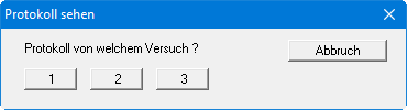 Die Knöpfe "1", "2" usw. stellen die eingegebenen Versuche als Knöpfe dar. Für jeden Versuch können Sie die wichtigsten Versuchsdaten in Protokollform darstellen lassen. Sind mehr als 35 Messungen für den ausgewählten Versuch vorhanden, müssen Sie die Anzahl für die Protokolldarstellung reduzieren.