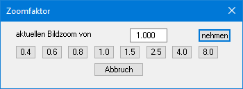 Sie können einen beliebigen Zoomfaktor zwischen 0,4 und 8,0 in das Eingabefeld eintragen. Durch anschließendes Klicken auf "nehmen" verlassen Sie die Box, die Eingabe wird als aktueller Faktor übernommen. Beim Klicken auf die Knöpfe "0.4", "0.6" usw. wird der angewählte Faktor direkt übernommen und die Dialogbox verlassen.