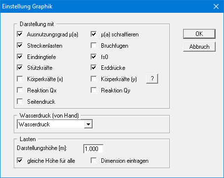 Je nach gewähltem Nachweiskonzept wird die "Sicherheit eta(a)" oder der "Ausnutzungsgrad µ(a)" dargestellt und ggf. schraffiert. Mit Körperkräften sind die Lasten aus Streckenlasten, Bodeneigengewicht, Reibungskräfte infolge Kohäsion und Reibungswinkel auf den beiden Flanken und die Kohäsionskraft an der Stirnseite gemeint. Die Reaktionskraft Q ist die Kraft infolge Reibungswinkel an der Stirnseite. Der Seitendruck wird ohne Anteil aus eventuell vorhandenen Streckenlasten mit einem Faktor für den Seitendruck > 0,0 dargestellt.