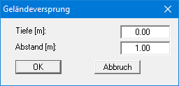In der Dialogbox definieren Sie die Tiefe des Geländeversprungs unter OK Gelände (positiv nach unten). Darunter geben Sie den Abstand des Geländeversprungs von der Leitwand ein.