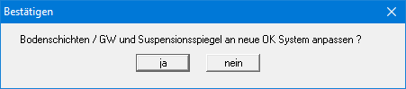 Im Normalfall sollen die Höhen der Bodenschichten etc. an die neue NHN-Höhe der OK Gelände angepasst werden. Deshalb klicken Sie in der Abfragebox auf den Knopf "nein". Eine Anpassung würde bedeuten, dass die als positiver Wert eingegebene Tiefe einer Bodenschicht von beispielsweise 7,5 m anschließend in eine absolute Höhe von -7,5 mNHN umgerechnet wird. Wenn Sie Ihr System also nur auf [mNHN] umstellen, wählen Sie immer "nein".