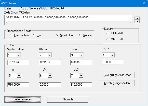 Oben wird die aktuelle Zeile der ASCII-Datei angezeigt. Mit den Pfeilen am rechten Rand bewegen Sie sich durch die Datei. Stellen Sie unter "Spalte Datum", usw. die Spalte ein, in der sich der Messwert befindet. Ist ein bestimmter Messwert nicht vorhanden, geben Sie eine "0" als Spaltennummer an. Falls alle Angaben richtig sind, erscheint in der Box unter den Spalten das Ergebnis für diese Zeile. Anderenfalls erscheint "Fehler". Verändern Sie dann gegebenenfalls das Trennzeichen für die Spalte oder das "Datumsformat". Enthält die Datei neben gültigen auch ungültige Zeilen, werden diese bei späterem Einlesen einfach überlesen. Zum Schluss wählen Sie den Knopf "Daten einlesen". Danach können Sie den Versuch weiter bearbeiten und auswerten. Die Nummern der Spalten werden im Dokument für jeden Einzelversuch getrennt abgespeichert. Sie werden auch in der Datei mit den Einstellungen GGU-TRIAXIAL.alg abgespeichert. Für einen neuen Versuch müssen die Spaltennummern nicht mehr eingestellt werden, wenn Sie entweder einen bestehenden Versuch laden und dann überarbeiten oder die Einstellungen aus der Einstellungs-Datei laden.