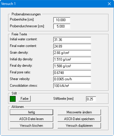In den oberen Eingabefeldern tragen Sie die Grundwerte des Dreiaxialversuchs ein. Die Texte der Eingabefelder können Sie über den Menüeintrag "Formblatt / Texte" Knopf "Einzelversuch" anpassen oder diese Eingabefelder auch komplett ausblenden (siehe Abschnitt 5.4.3).