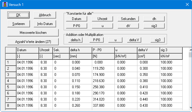 Nach Klicken auf den Knopf "Messwerte ändern" erhalten Sie eine Dialogbox, in der Sie fortlaufend die Ergebnisse Ihres Dreiaxialversuches (Datum, Uhrzeit usw.) eingeben.