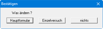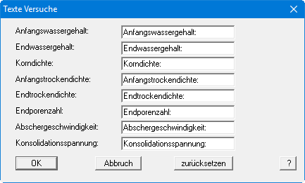 Wenn Sie auf den Knopf "Einzelversuch" in der obigen Auswahlbox klicken, erhalten Sie die folgende Dialogbox, in der Sie die Beschriftung der Eingabefelder für die Grunddaten und die Tabellendarstellung der Versuchsdaten auf dem Formblatt bearbeiten können: