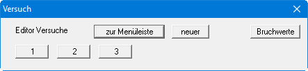 Wurden bereits Versuche eingegeben, können Sie über diesen Knopf die Bruchwerte zu den einzelnen Versuchen in einer Infobox darstellen und dort über den Knopf "Klemmbrett" in die Windows-Zwischenablage speichern.