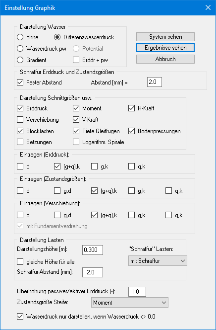 Die Dialogbox ist weitgehend selbsterklärend. Wenn beispielsweise der Schalter "Setzungen" aktiviert ist, wird der Spannungsverlauf unter dem Fundament für den kennzeichnenden Punkt dargestellt. Wenn der Schalter "Erddr. + pw" aktiviert ist, wird die Summe aus Erddruck und Wasserdruck (pw) im Diagramm für den Erddruck eingetragen.
