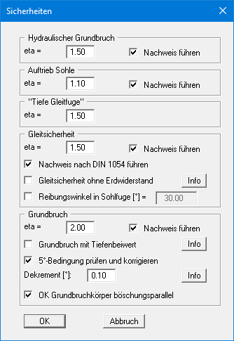 Geben Sie anschließend die Sicherheitsbeiwerte für die einzelnen aufgeführten Nachweise ein. In der Box sind beim Neustart des Programms die nach EAB geforderten Werte eingestellt. Wenn Sie einen Nachweis nicht vom Programm führen lassen wollen, deaktivieren Sie den entsprechenden Schalter. Über die zwei "Info"-Knöpfe erhalten Sie weitere Informationen.