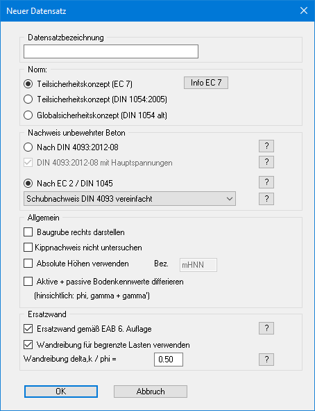 Im unteren Bereich der Dialogbox können Sie die neuen Regelungen bezüglich der Ersatzwand gemäß der 6. Auflage der EAB auswählen. Die neuen Regelungen sind in "Bautechnik Heft 8 (20202)" erläutert.