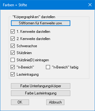 Der Unterfangungskörper wird mit einer Vielzahl grafischer Elemente (Stützlinie, Kernweiten usw.) dargestellt. Sie können die einzelnen Elemente von einer Darstellung ausschließen, die Stiftformen (gestrichelt, punktiert usw.) und Füllfarben verändern.
