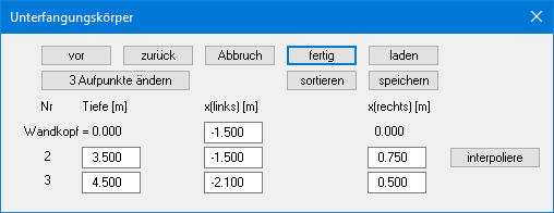Verändern Sie die Anzahl der Aufpunkte des Körpers auf 3 und geben Sie die Werte der Dialogbox ein. Die Tiefenangaben beziehen sich auf OK Wandkopf. Für jede Tiefe müssen Sie zwei Koordinaten (linker und rechter Wandpunkt) eingeben (siehe auch "Theoretische Grundlagen: Unterfangungskörper").