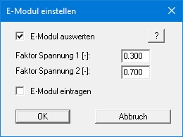 Aktivieren Sie den Schalter "E-Modul auswerten", wenn das E-Modul mit den entsprechenden Spannungsfaktoren berechnet werden soll. Das Ergebnis wird in der Tabelle der Versuchs-Ergebnisse auf dem Formblatt ausgegeben. Soll der Wert im Diagramm erscheinen, aktivieren Sie den Schalter "E-Modul eintragen".