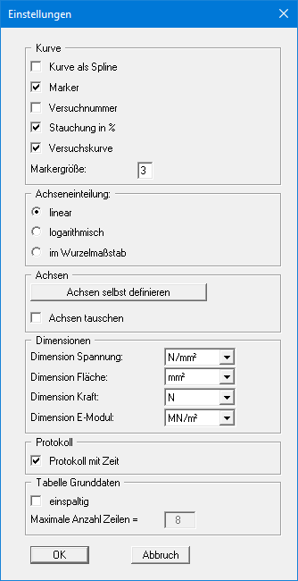 Im nächsten Bereich können Sie die Dimensionen für Spannung, Fläche, Kraft und E-Modul auswählen. Darunter können Sie die Darstellung des Protokolls mit der Zeit aktivieren und die Tabelle der Grunddaten, die auf der Diagrammseite dargestellt wird, beeinflussen.