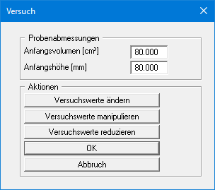In die ersten beiden Zeilen werden das Anfangsvolumen und die Anfangshöhe der Probe eingegeben. Diese Werte werden für die Auswertung benötigt. Folgende weitere Aktionen sind möglich: