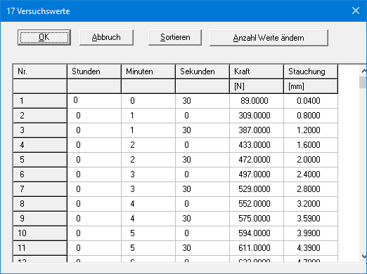 In der Dialogbox werden die für die Auswertung relevanten Versuchsergebnisse eingegeben. Im angegebenen Beispiel sind bereits 17 Versuchswerte eingegeben. Nach Drücken des Knopfes "Anzahl Werte ändern" öffnet sich eine Dialogbox, in der Sie die gewünschte Anzahl von Wertepaaren eingeben können. Sind noch keine Werte vorhanden (neuer Versuch), steht in der Box eine "0". Durch Vergrößern der Zahl werden Wertepaare hinzugefügt, durch Verkleinern der Anzahl können Sie vorhandene Wertepaare am Ende der Tabelle löschen.
