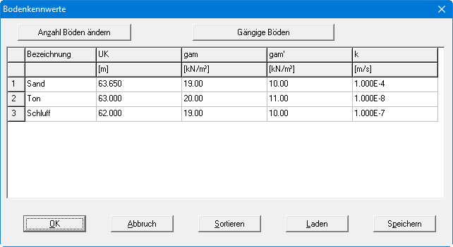 Wählen Sie den Menüeintrag "Bearbeiten / Böden". Sie erhalten die Eingabe-Dialogbox, die die Startvorgaben des Programms enthält, nämlich eine Bodenschicht Schluff mit den entsprechenden Bodenkennwerten.