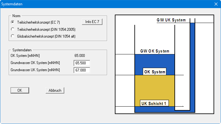 Über diesen Menüeintrag legen Sie die Systemgeometrie unter Angabe des Grundwasserstandes an Oberkante und Unterkante des Systems fest.