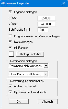 In der Allgemeinen Legende können, wenn gewünscht, Informationen zum Programm (Name und Version), zur verwendeten Norm und zur aktuellen Datei (Name, Pfad, Zeitinfo) mit dargestellt werden. Wenn Sie eine Datensatzbeschreibung eingegeben haben, wird diese ebenfalls in der Allgemeinen Legende dargestellt. Wenn Sie die Schalter im unteren Bereich aktivieren, werden die verwendeten Teilsicherheiten in der Legende aufgeführt.