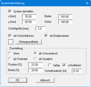 Wenn der Schalter "System darstellen" in der folgenden Dialogbox aktiviert ist, erhalten Sie eine Darstellung Ihres Grundwassersystems und der darin enthaltenen Berechnungsergebnisse. Dabei geben Sie im oberen Bereich die Einstellungen für das generelle System vor und im unteren Bereich beeinflussen Sie die Darstellung Ihrer Berechnungsergebnisse. Wenn Sie das Verfahren nach Aulbach/Ziegler aktiviert haben, stehen Ihnen nur die oberen Einstellungen zur Verfügung.