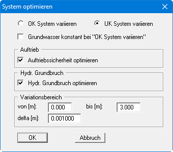 Der geforderte Nachweis wurde mit dem eingegebenen System nicht erbracht. Wählen Sie nun den Menüeintrag "System / optimieren" und geben Sie den folgenden Variationsbereich ein: