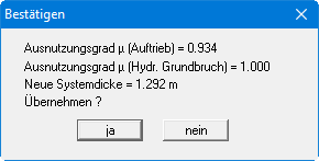 Für den optimalen Ausnutzungsgrad ist demnach eine Dicke der Tondichtung von 1,29 m notwendig. Wenn Sie die Frage "Übernehmen ?" durch Klicken auf den Knopf "ja" beantworten, wird bei den Bodenkennwerten unter "Bearbeiten / Böden" die ermittelte Systemdicke als neue Unterkante übernommen. Das Ergebnis in den Legenden wird automatisch angepasst.