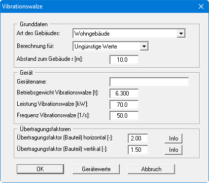 Die Eingaben entsprechen der Eingabe bei Vibrationsrammen. Zusätzlich zu Leistung und Frequenz ist hier für das Gerät noch das Betriebsgewicht der Vibrationswalze einzugeben.