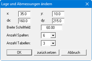 Unter diesem Menüeintrag lassen sich nicht nur Größe und Position des Tabellen-Elements variieren, sondern auch der Aufbau der Ergebnistabelle. Sie können in der Dialogbox festlegen, wie viele Spalten Ihre Tabelle haben soll und ob Sie ggf. mehrere Tabellen anlegen möchten. Die Gesamtgröße der Ergebnistabelle wird über "dx" und "dy" festgelegt. Identische Optionen zur Veränderung der Tabellendarstellung bietet der Menüeintrag "Formblatt / Tabelle".