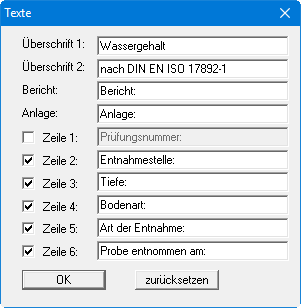 Ihre Eingaben in den Zeilen 1 bis 6 in der obigen Dialogbox ebenso wie die Eingaben unter "Bericht:" und "Anlage:" sind zugleich die Bezeichnungen der Eingabefelder in der Dialogbox des Menüeintrags "Bearbeiten / Allgemein". Wenn Sie in der obigen Dialogbox Zeilen deaktivieren, werden die entsprechenden Eingabefelder in der Dialogbox des Menüeintrags "Bearbeiten / Allgemein" ebenfalls deaktiviert.